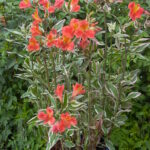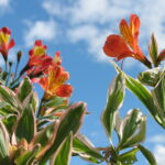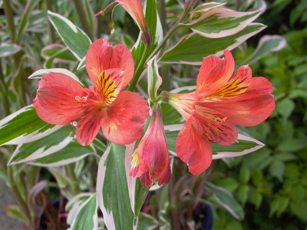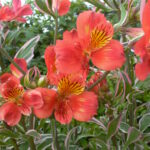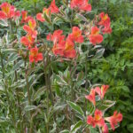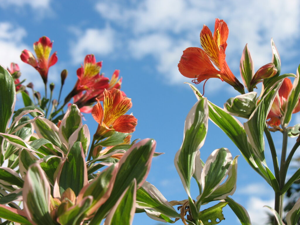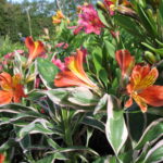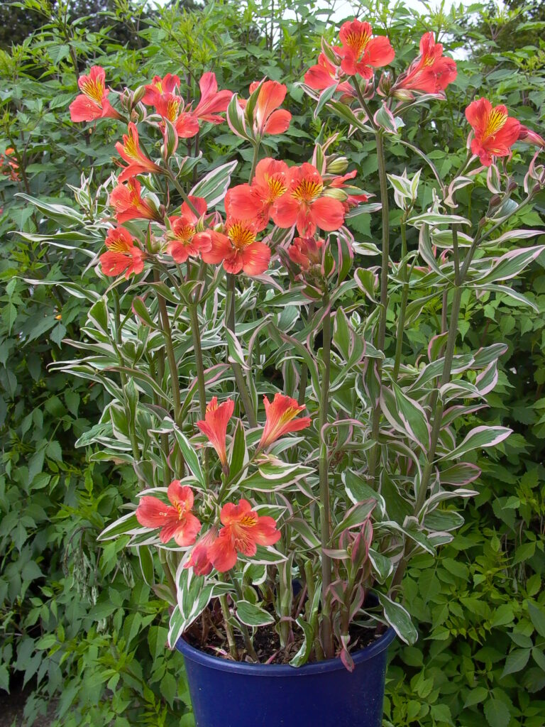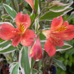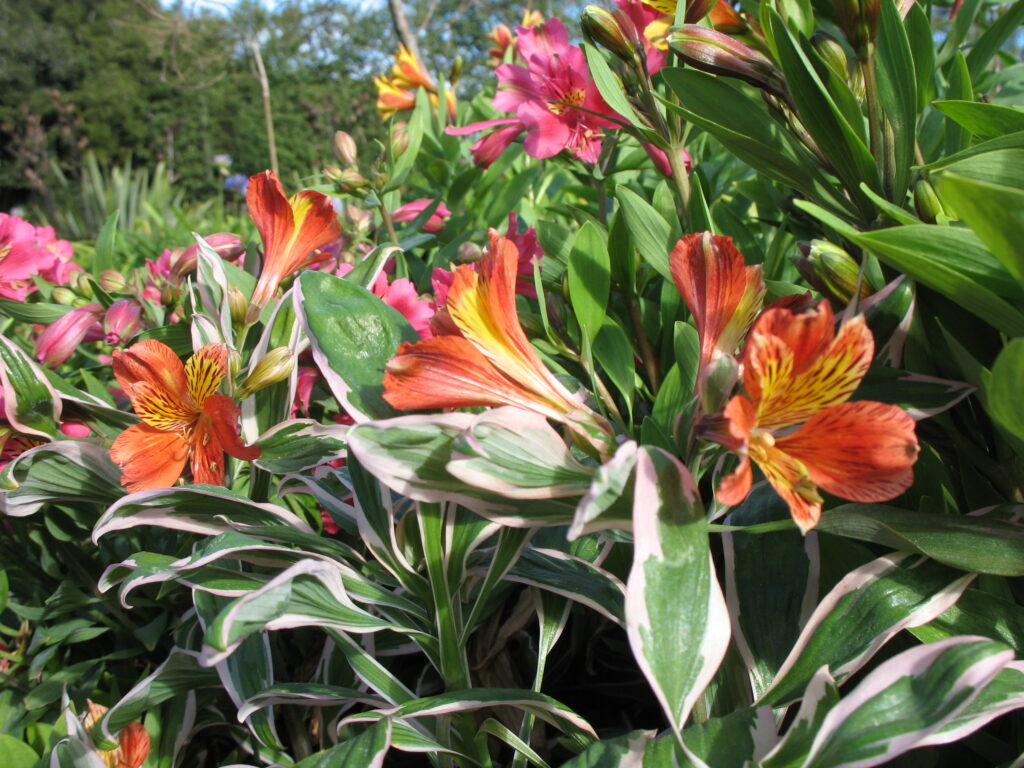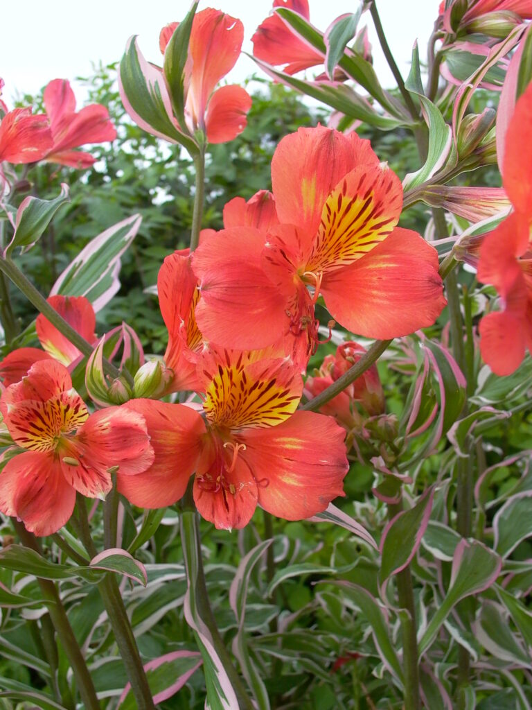 This fascinating garden Alstroemeria has it all. Not only is the form compact and suitable for a garden but the foliage is a striking variegated leaf with a pink edge. This wild profusion of foliage is topped with masses of deep orange flowers all summer long. What a flamboyant plant! Discovered in New Zealand this member of the Inca Alstroemeria family will set your garden ablaze with a party atmosphere…take me to the Mardi Gras!!