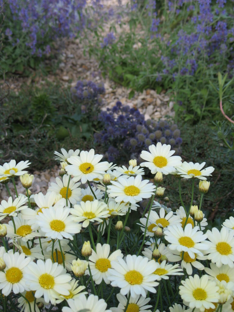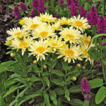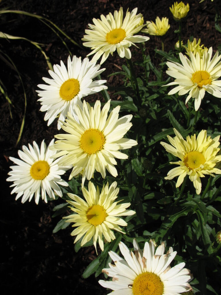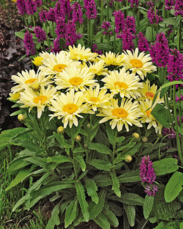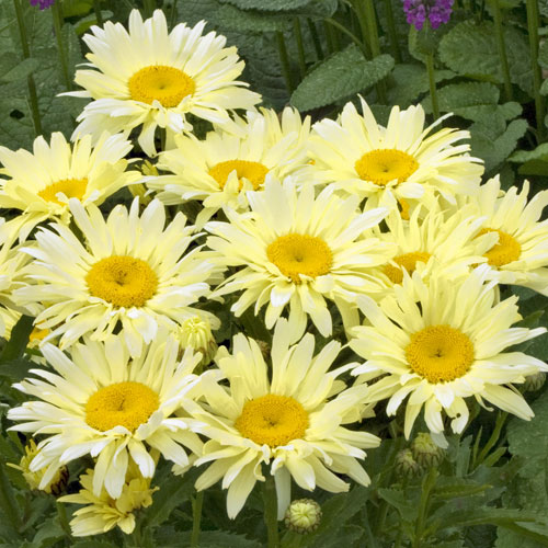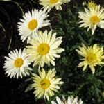 Another superb new Shasta Daisy, Like ‘Paladin’ this Leucanthemum has a double ruffled petal form on strong upright stems. While ‘Paladin’ is a true white, Leucanthemum ‘Banana Cream’ as its name implies, opens as a lemon yellow lightening to butter-cream in full flower with a vibrant yellow eye. Gorgeous! ‘Banana Cream’ flowers all summer long, with masses of flower heads due to the plant’s characteristic of flowering from every axillary shoot. The habit of ‘Banana Cream’ is similar to ‘Paladin’ in that it is a compact, disease resistant plant. As a cutting flower the stems have an extended vase time of up to two weeks. Good in pots or in the border. Grow Leucanthemum ‘Banana Cream’ in full sun in well drained soil. If planted in an area with low to moderate soil fertility it will remain nice and compact. May require some support in richer soils. I notice it does prefer to be kept moist in the garden during the summer months. Remove spent flowers to encourage re-blooming.