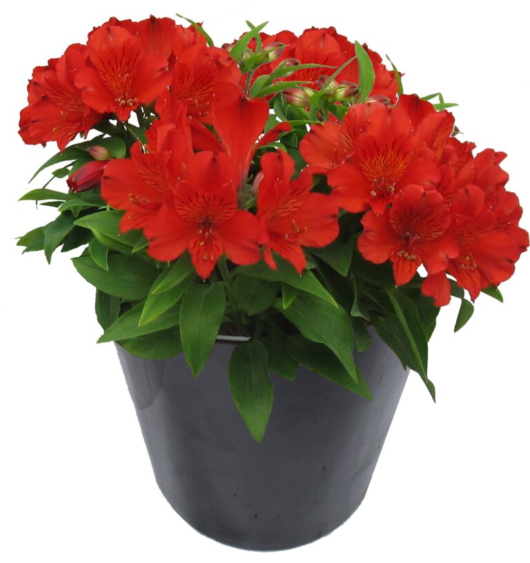 A compact garden Alstroemeria with masses of pure red flowers on healthy foliage. Flowers are distinctively different in that they have no yellow throat markings....