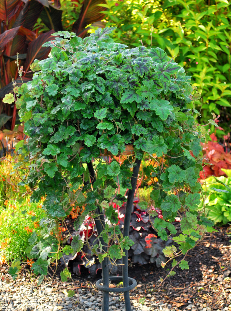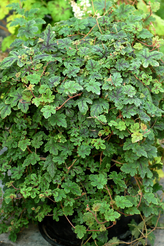 Tiarella ‘Happy Trails’ features delightful white flowers on a vigorous low growing plant. Sports a profusion of runners and charming small rounded lobed leaves marked with a thick black band on the veins. Wonderful as a shaded groundcover, or in a mixed container or hanging basket. The lime green veined leaves hold their foliage colour throughout the year. Dark red stems are effective and contrast nicely for winter interest.